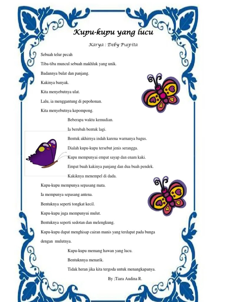Untuk anak sekolah dasar (sd), smp, dan sma. Aku adalah jenazah bagi setiap hasrat dan kesintalanmu. Sayap indah mu pernah di sini di antara bunga engkau menari sejenak engkau memberi warna bersama bunga engkau merona indah dan mempesona Ratusan bahkan ribuan bunga tumbuh di bumi pertiwi, mulai dari mawar, melati, sedap malam, kamboja dan sebagainya yang sering dijadikan sajak pendek maupun . Kunci jawaban buku tematik 5 kelas 2 sd/mi.
